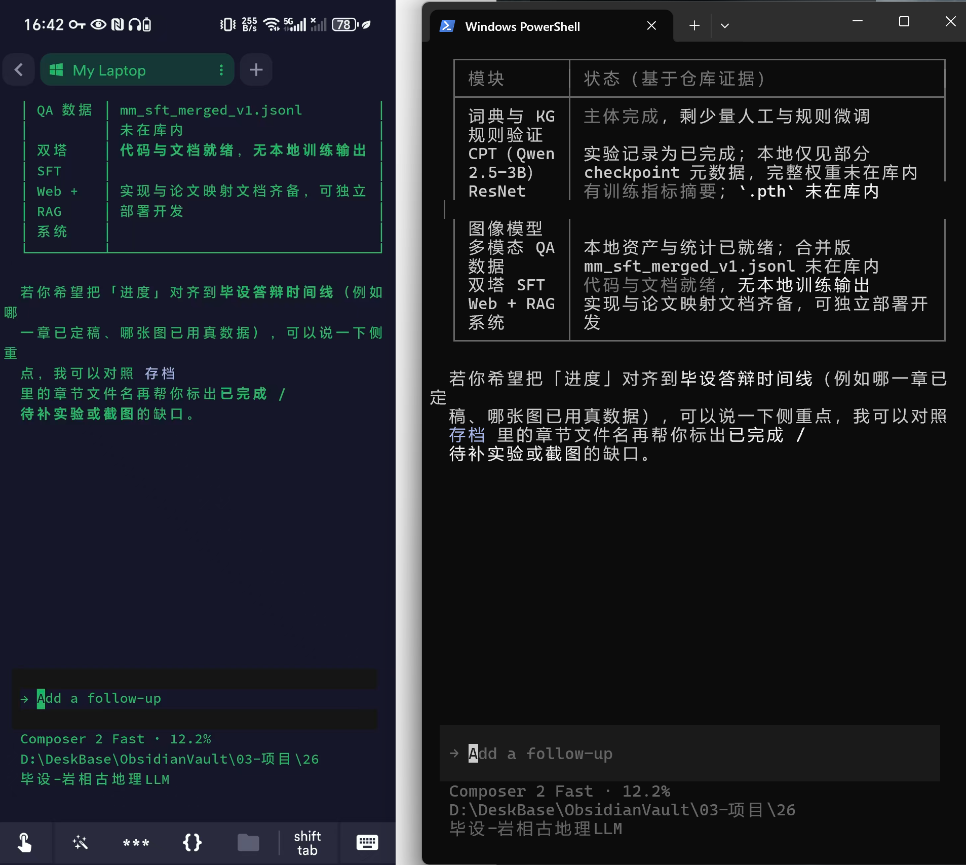 cd /d "【项目地址】",然后执行agent ls打开agent列表,找到刚刚的agent,然后回车进入 - 在终端中使用Agent。如下图:左为手机端界面,右侧为PC powershell界面。